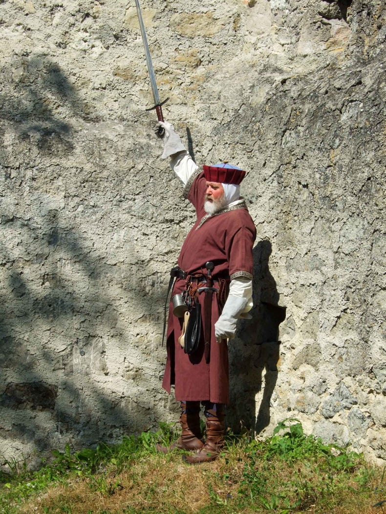 Der Ritter „Schwaben-Jörg“ tritt bei dieser Führung in historischer Gewandung auf, wie sie zur Zeit des Burgenbaus im 13. und 14. Jahrhundert zu sehen war.